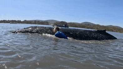Rescuers successfully towed a young humpback whale off a sandbar in Wallis Lake, where it had stranded for about 24 hours. The 9.5-meter, 12-tonne whale is now swimming freely but has not yet reached the ocean. Authorities are monitoring the situation and have temporarily closed the Forster-Tuncurry Bridge for the whale's safe passage.