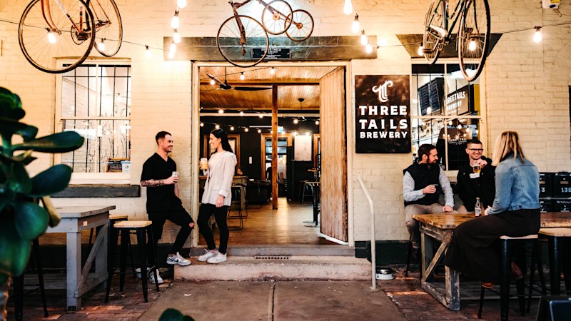 Three Tails Brewery, founded by Mick Ash, John Latta, and Ned Kelly, opened in [location] with a capacity of 300 people. The brewery features 21 of its own beers on tap, including a wine-beer hybrid made from cabernet grapes. It hosts Beer Geek Sunday, showcasing rare brews from Australia and other regions.