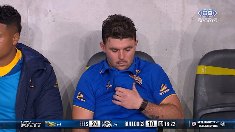 Ryley Smith sits on the Parramatta bench with a sternum problem.