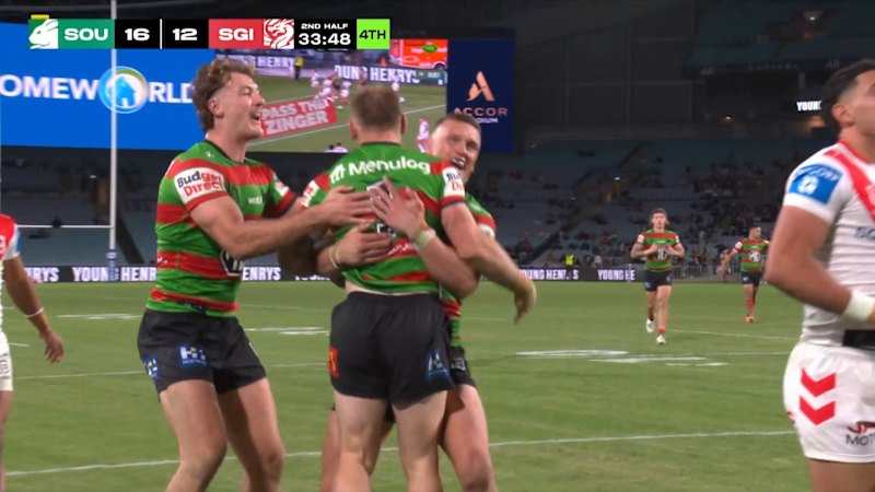 In his first NRL game in 1420 days, Matt Dufty scored to extend the Rabbitohs' lead against the Dragons.