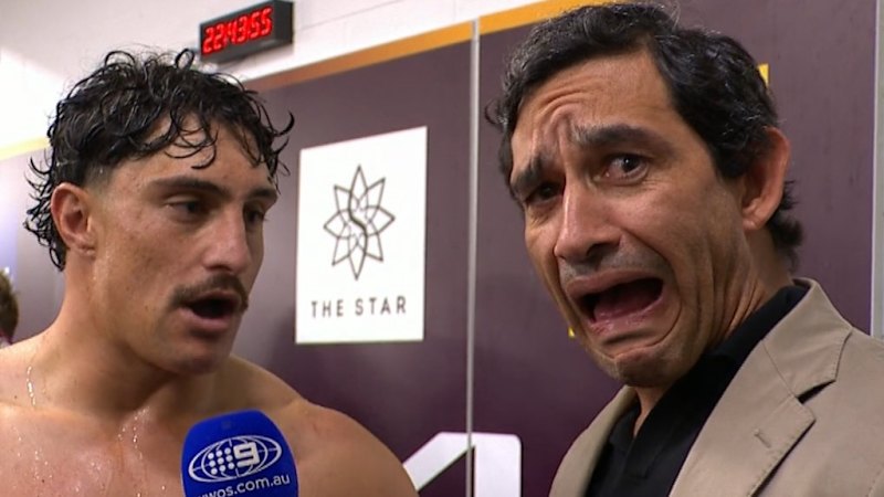 Kotoni Staggs makes a comment about the injury he's carrying, prompting Johnathan Thurston to pretend to spew up.
